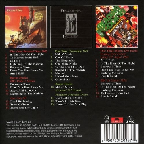 CD3: 01. Am I Evil (Reading Rock Festival'82) 02. In The Heat Of The Night (Reading Rock Festival'82) 03. Borrowed Time (Reading Rock Festival'82) 04. Don't You Ever Leave Me (Reading Rock Festival'82) 05. Sucking My Love (Reading Rock Festival'82) 06. Play It Loud (Reading Rock Festival'82) 07. Borrowed Time (BBC In Concert'82) 08. In The Heat Of The Night (BBC In Concert'82) 09. Sucking My Love (BBC In Concert'82) 10. To Heaven From Hell (BBC In Concert'82) 11. Play It Loud (BBC In Concert'82) Time: 73:06 + 58:32 + 79:42