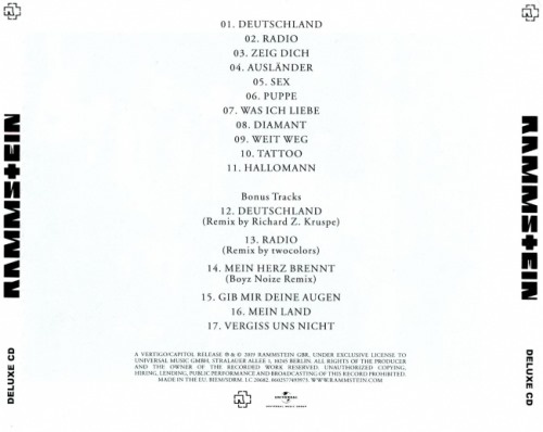 Tracklist: 01. Deutschland 02. Radio 03. Zeig Dich 04. Auslander 05. Sex 06. Puppe 07. Was Ich Liebe 08. Diamant 09. Weit Weg 10. Tattoo 11. Hallomann 12. Deutschland (bonus' Remix by Richard Z. Kruspe) 13. Radio (bonus' Remix by Twocolors) 14. Mein Herz Brennt (bonus' Boyz Noize Remix) 15. Gib Mir Deine Augen (bonus) 16. Mein Land (bonus) 17. Vergiss Uns Nicht (bonus) Time: 74:06